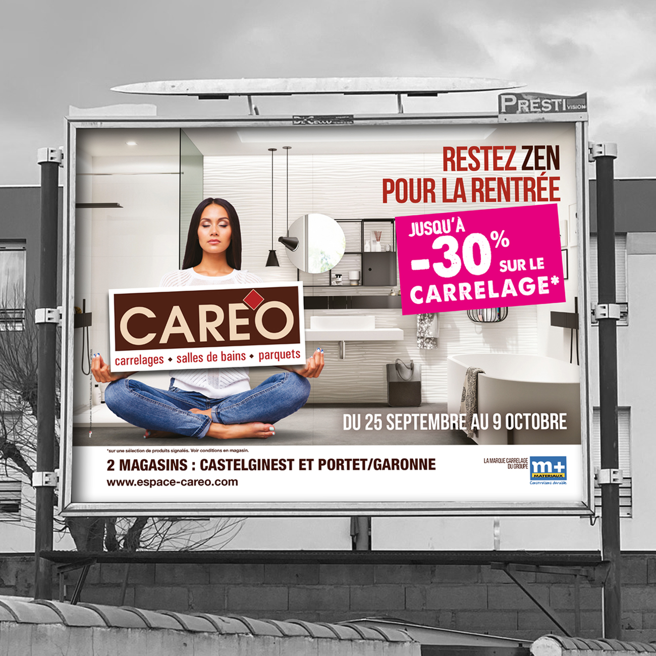 Réalisation d’une campagne d’affichage promotionnelle pour l’enseigne CAREO, marque spécialiste carrelages, aménagements extérieurs et sanitaires du groupe M+.